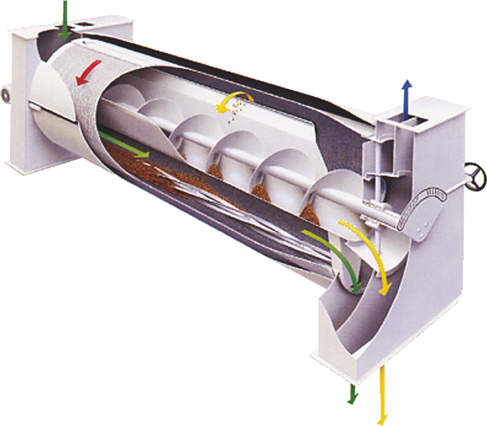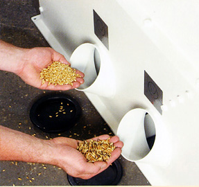 物料從主機架上部入口處進入窩眼滾筒內,旋轉的窩眼滾筒上沖有尺寸精確的氣泡式窩眼,小于窩眼內徑的顆粒會嵌入窩眼內,隨滾筒上行一定距離后落入中心U型料槽,而后被U型料槽內的螺旋攪龍排出設備;而較長或較大的顆粒則因無法嵌入窩眼內徑而滯留在滾筒里,最終經由滾筒內的另一端出口排出。因此,窩眼筒精選機不僅可以去雜質,也可以當成更精準的分級機使用。